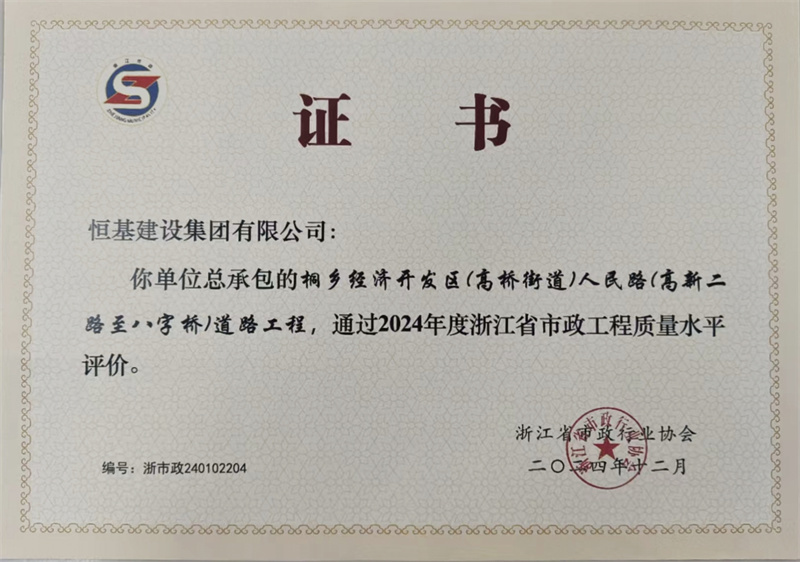 近日,浙江省市政行业协会公布“2024年度浙江省市政工程质量水平评价工程”评选结果,集团公司承建的“桐乡经济开发区(高桥街道)人民路(高新二路至八字桥)道路工程”榜上有名。浙江省市政工程质量水平评价是浙江省市政行业内建设工程质量方面的最高水平评价,代表市政工程行业同时期浙江省先进水平。(原浙江省市政公用金奖示范工程)。