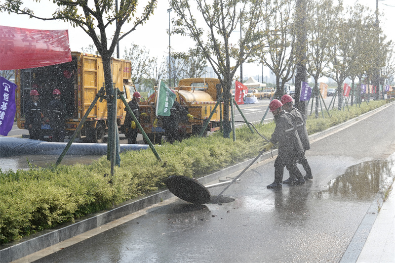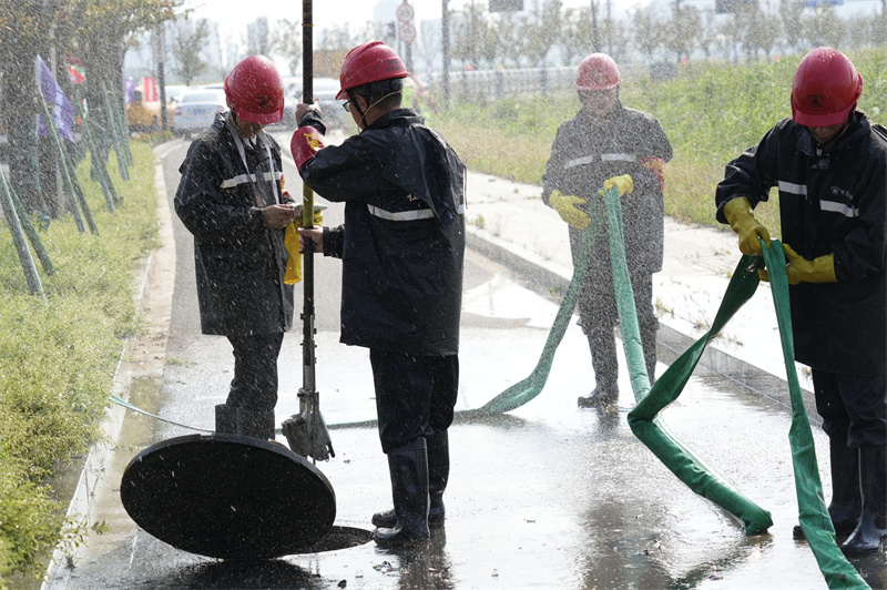 廖志浩担任本次应急演练指挥长,集团公司内涝应急抢险队全程承担本次演练任务。演练模拟暴雨天气,区域内涝的抢险全过程。某路段积水超过30公分,主干道出现树木倒伏,雨水口堵塞,人员被困情况。险情发生,市住建局紧急启动城市防汛排涝应急预案,集团公司应急救援队接到指令,立即前往救援,应急救援车辆赶到现场,救援队迅速设置围栏,施救被困人员,清除倒塌树木及杂物,采用疏通车进行管道疏通。为能尽快清除积涝,救援队同时使用移动水泵进行快速排水抢险。经过近30分钟的救援疏通,内涝险情解除,并将现场处置情况上传至城市内涝智慧平台。