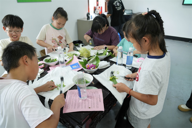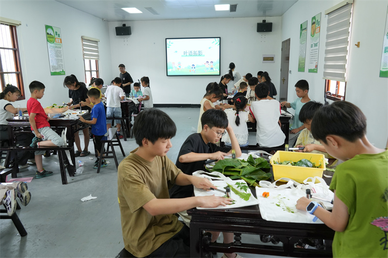 “叶语拓影”植物拓印创意手工制作,让活动进入高潮,在志愿者老师的指导下,小朋友从联庄基地凤鸣家庭农场内精心挑选采集了树木、花卉、农作物等植物叶子和各式花瓣,通过定位、覆膜、敲拓等步骤,将植物的脉络与色彩永久定格在白色帆布包上。在制作过程中,大家相互交流、互相帮助。伴随 “咚咚” 的敲击声,叶片的脉络逐渐清晰地印在帆布包上,一幅幅栩栩如生的树叶图案便呈现在大家眼前。小朋友们分享着自己的创意和灵感,现场充满欢乐和谐的氛围。