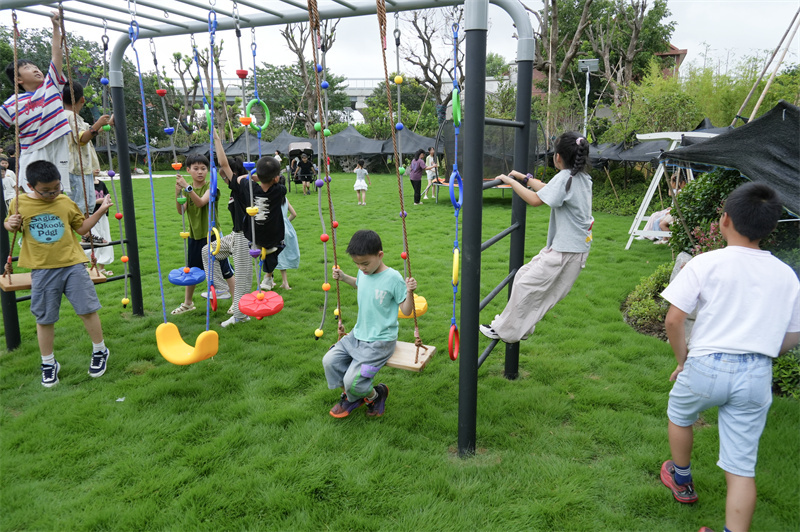 听歌猜动画片、草坪小游戏,小朋友积极参与,当熟悉的动画片主题曲响起,小朋友们瞬间沸腾,跟着旋律轻声哼唱,小手举得高高的,生怕错失答题机会。踊跃举手抢答,气氛热烈。在凤鸣家庭农场草坪上、多功能攀爬运动架、蹦蹦床中,每个小朋友玩得尽兴,笑意盈盈,欢声笑语充溢于耳,团队游戏增加了学生们的默契和配合程度。