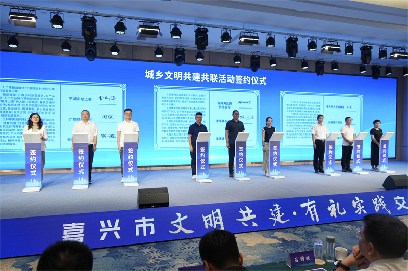 活动中,各县(市、区)的全国文明单位、全国文明村及其周边村代表共同签订了城乡文明共建共联项目协议,正式开启了“1 1 1”共建结对合作的新征程,实现城乡文明建设的深度融合与协同发展。同时还举行了嘉兴市首批“文明相帮人”聘任仪式,来自嘉兴市各全国文明单位的“文明相帮人”,将作为文明共建的桥梁和纽带,从“顺手就能做、当下就能帮”的小事做起,为城乡文明建设添砖加瓦。活动现场还发布了“我就是公益广告”全民征集活动首批优秀作品,开展了“浙江有礼·红船领航”有礼实践大课堂等活动。
